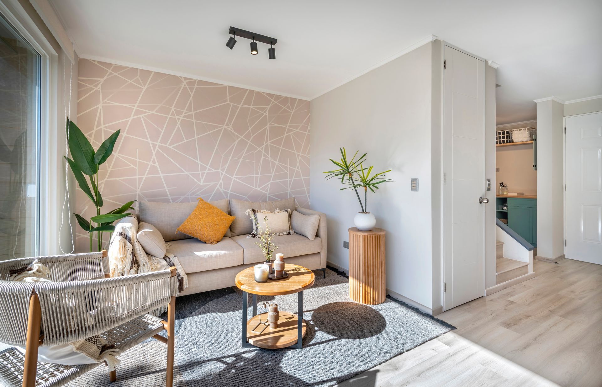 Logotipo para la empresa VDecoraciones. Gráfico "V" colorido: rosa, naranja, verde azulado y amarillo.